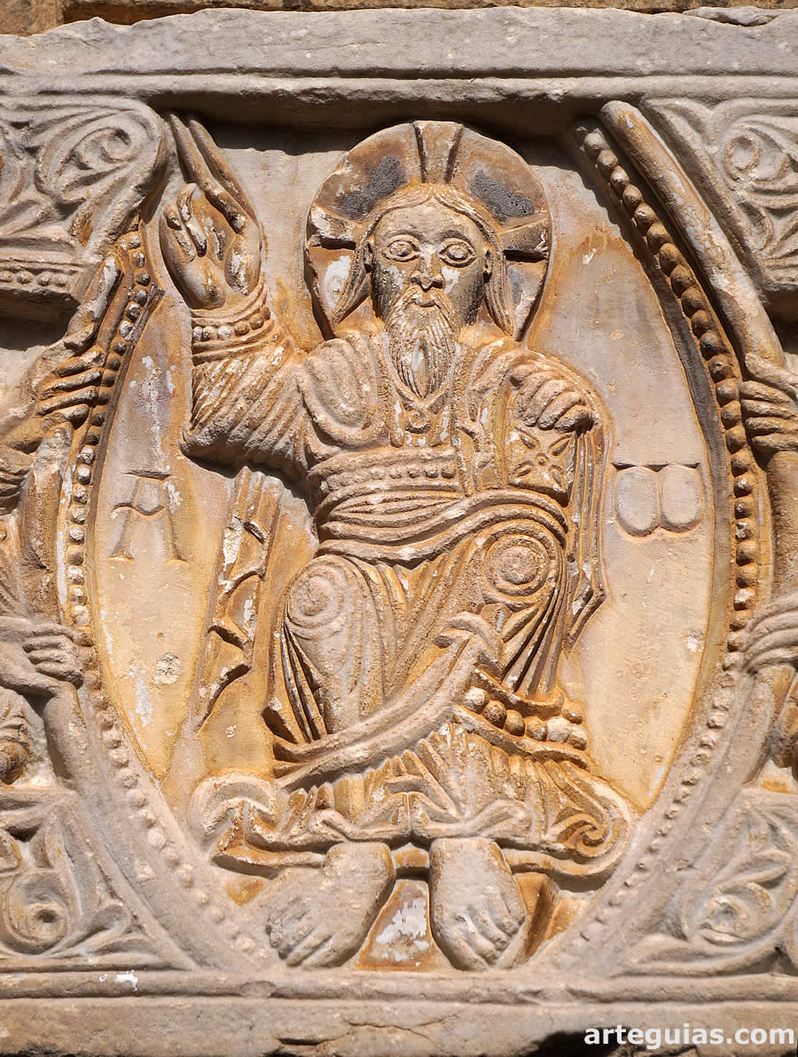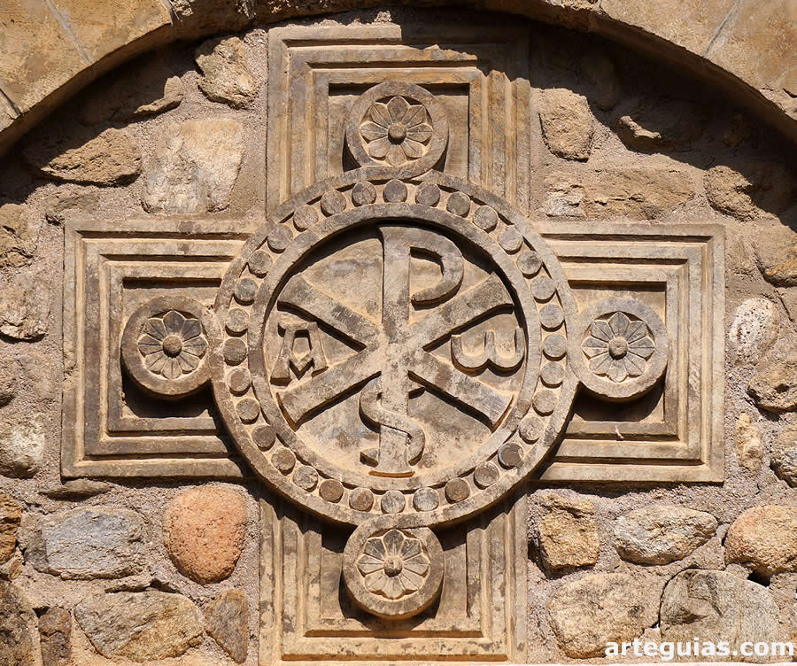 Encima de este dintel y correspondiendo al tímpano de la puerta se encastró un relieve esculpido en el centro rodeado de mampostería y mortero. Este relieve es una cruz griega que lleva en el centro un gran crismón inscrito en un círculo con bezantes. En los cuatro extremos verticales y horizontales del crismón hay otros círculos más pequeños con flores octopétalas en su interior.