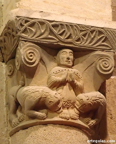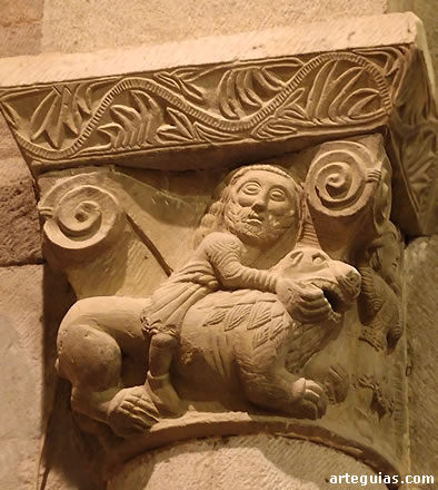 También el interior conserva interesantes esculturas en los capiteles que soportan el arco triunfal con bellos leones afrontados.