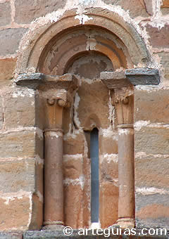 En concreto, el ábside semicilíndrico está dividido en calles por finas columnas que apoyan en plinto. En medio de estas calles se abren elegantes ventanales. Hasta aquí tenemos una disposición clásica de los ábsides románicos. La peculiaridad es que se añadieron columnitas a los lados de las columnas citadas para recoger arcos murales que se desarrollan en cada calle, envolviendo a las mencionadas ventanas. Este juego de líneas curvas (arcos y ventanas) y rectas (fustes columnarios) imprimen un estético y sugestivo ritmo a este ábside. Parecida disposición la encontramos en la burgalesa iglesia del Monasterio de Rodilla.