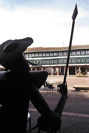 | Simpática tienda en la Plaza Mayor de Almagro | La famosa Plaza Mayor de Almagro. Ciudad Real | El Quijote en la Plaza Mayor | Célebre Corral de comedias |