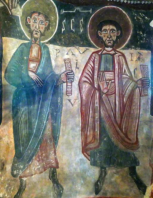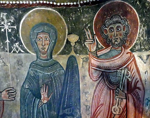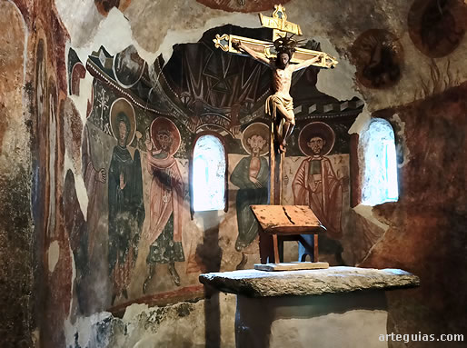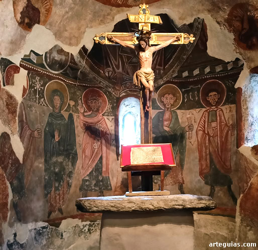 Como era casi una norma casi cumplida a rajatabla, un Cristo en Majestad (realmente la parte inferior que era lo único que se conservaba) presidía la bóveda de cuarto de esfera del ábside junto al Tetramorfos del que sólo ha sobrevivido el buey de San Lucas. En el muro curvo del hemiciclo inferior se pintó el Apostolado acompañado por la Virgen María.