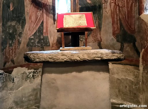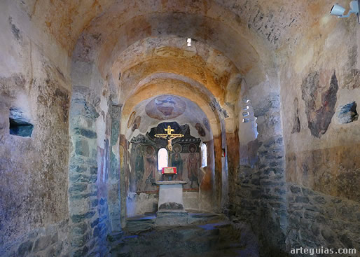 También se conserva la mesa de altar hecha con un pilar de piedra pómez y una losa de esquisto a modo de ara. En su interior conservaba originalmente la lipsanoteca y un frasco de vidrio con reliquias (tejido y huesos). El citado pie aún conserva restos de pintura mural románica.