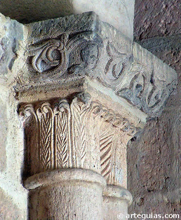 toscos capiteles vegetales, apoyados sobre podio, que sujetan un