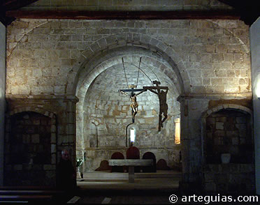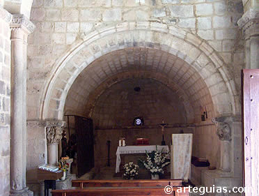 La cabecera es mucho más baja que la nave. El arco triunfal semicircular apoya sobre dobles columnas con capiteles de raíz silense. En el capitel septentrional se muestran centauros disparando su flecha a un cuadrúpedo con cabeza humana que lleva en su lomo una arpía encapuchada. En el capitel opuesto hay una serie de monstruos difíciles de identificar enmarañados, con figuración vegetal.