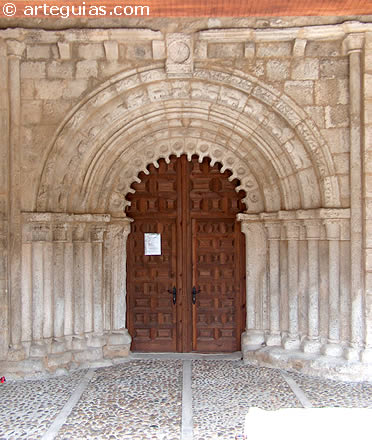 El guardapolvos está decorado con tallos ondulantes. La arquivolta externa es de ancho baquetón, la segunda se decora con una escocia estrecha, la tercera muestra decoración de doble zigzag formando rombos. Por último, la arquivolta interna es polilobulada con una rosa inscrita en un círculo en cada dovela. El conjunto es soportado por las jambas interiores y tres pares de columnas con decoración vegetal esquemática. Las esquinas de las jambas a las que se acodillan las columnas tiene sus aristas aboceladas imitando columnillas más finas. Todos estos aspectos los veremos en la puerta de Villacadima, por lo que es innegable que ambas obras pertenecen al mismo taller.