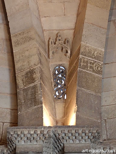 Hay que fijarse meticulosamente en estos nervios y en sus apoyos. Veremos que dichos nervios surgen por parejas del centro de cada cara del polígono. Entre ellos queda un espacio horadado mediante una celosía que corresponde a la luz de los ventanales exteriores del cuerpo superior. Estas aberturas van coronadas por lo que se viene considerando representaciones de castillos, aunque creemos que se trata de relieves alusivos a la Jerusalén Celestial.