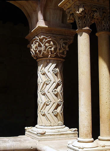 Posiblemente, los elementos que más han llamado siempre la atención son las columnas angulares del claustro, de grueso fuste decorado con motivos geométricos y florales cuyos capiteles vegetales, muestran entrelazos que casi de desprenden del resto gracias a los esmerados calados conseguidos a base de trépano.