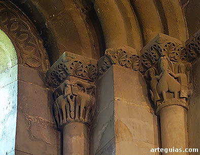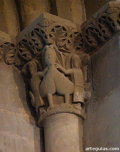 en el ángulo del capitel, y, sobre ellos, dos animales cuya