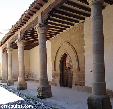 Su construcción se acometió entre los siglos XIV y XV, siguiendo la estética del gótico, aunque en la actualidad se encuentra muy desfigurado, debido a las numerosas intervenciones que ha recibido. Consta de cuatro pandas que bordean todo su perímetro, abiertas mediante arcos lobulados de piedra que se sostienen sobre pilares de sección octogonal. Originalmente tan sólo contaba con un piso, pero en el siglo XVIII se añadió una segunda altura, con un cuerpo de ladrillo, lo que obligó a reforzar la estructura original de piedra con pilastras de ladrillo, que enmascaran en gran parte la estructura gótica.