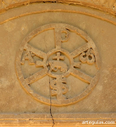 En el tímpano hay un relieve de un crismón trinitario, con lo símbolos apocalípticos y un Agnus Dei con la cruz en el centro.
