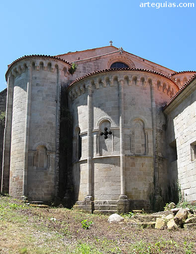 Las tres naves rematan en tres ábsides semicirculares, dándose la peculiaridad de que el central es más bajo que los laterales. Esto permitió a los constructores abrir un rosetón encima del ábside central, que ilumina el interior del templo y que, de no ser por él, resultaría demasiado oscuro. El profesor Castiñeiras opina que quizás este óculo se abrió en el momento en el que se sustituyeron las cubiertas de madera por las bóvedas de piedra.