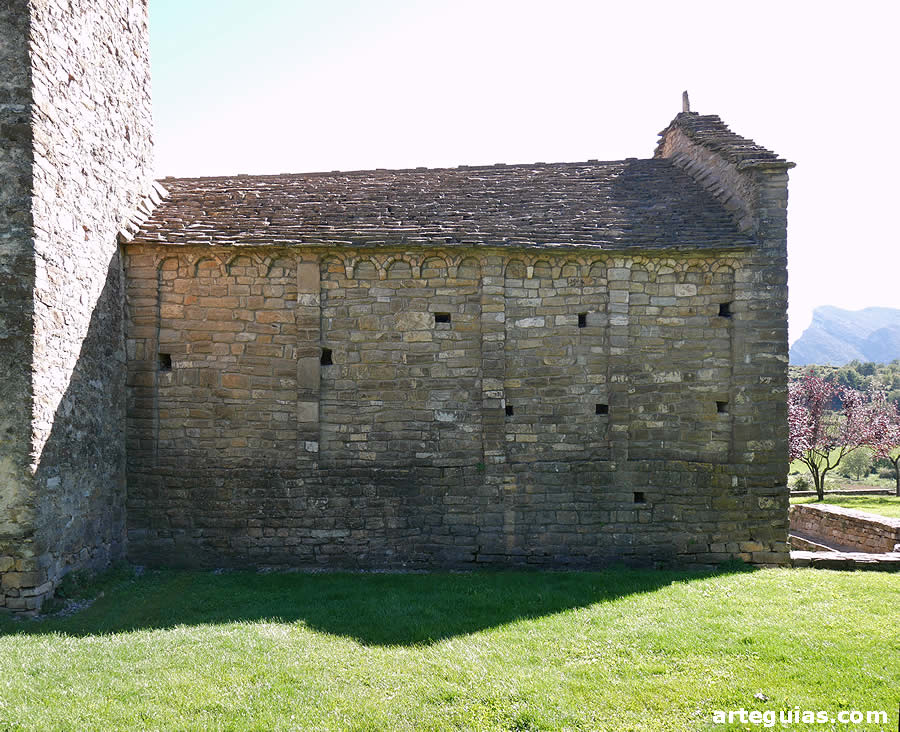 Tanto el muro septentrional como su fachada occidental también se engalanan con arquillos lombardos.