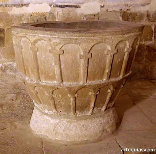 Por último, en relación al arte mueble, destaca la pila bautismal tardorrománica, situada actualmente en el ábside de la epístola. Está formada por una base y un cuerpo superior, ambos de piedra arenisca. Se decora con dos franjas de arquillos ciegos separados por una imposta.