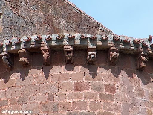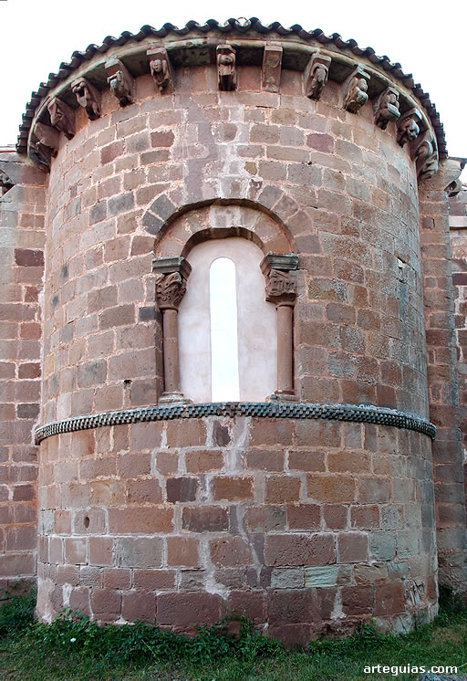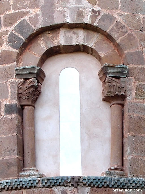 Tan solo una moldura horizontal ajedrezada y un ventanal rompen la lisura del paramento absidial, presentando esta última una saetera enmarcada por un arco de medio punto sobre columnas con extraños capiteles de motivo geométricos y vegetales.