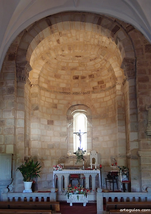 Al interior del templo de nuevo el interés se concentra en la cabecera, cubriendo el ábside con bóveda de horno y abriéndose en el eje axial una ventana en arco de medio punto sobre capiteles, uno vegetal y el otro presentando un misterioso personaje de cabellera rizada que parece levantarse sus ropajes para mostrar sus piernas.