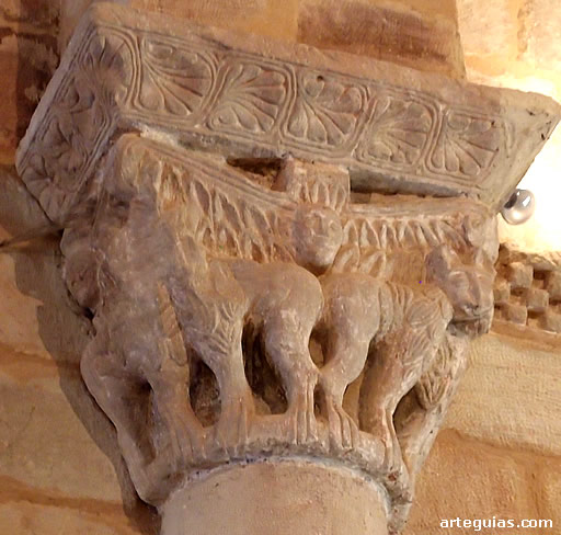Mucho más interesantes aún son los capiteles del arco triunfal, presentando el del lado del evangelio varios leones compartiendo cabeza en el vértice de la cesta junto a cabecitas humanas.