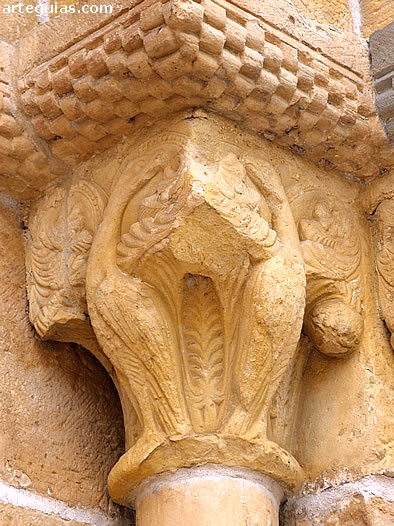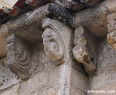 Los canecillos son variados aunque hay un tema que se repite bastante: cabezas de perro o lobo del que emergen unas especies de plantas con varias hojas arqueadas. También hay alguna cabeza andrófaga además de una serpiente y algunas águilas, amén de otras figuras geométricas abstractas o al menos difícilmente identificables, mientras que los capiteles de las columnas entregas muestra parejas de aves estilizadas muy parecidas a las de la puerta.