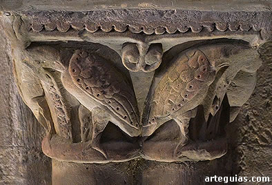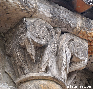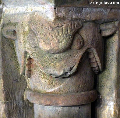 Del conjunto de capiteles hay que destacar algunos con temas zoomorfos (especialmente esquemáticas aves) y cabezas de bestias engullendo los fustes (gloutons).