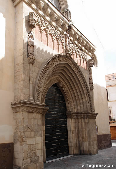 Tiene tres puertas, la principal es de piedra con arquivoltas baquetonadas de perfil ojival. La exterior tiene zigzagueado y guardapolvos de puntas de diamante. En sus enjutas se dispusieron relieves de personajes sagrados bajo doseletes de estética gótica.