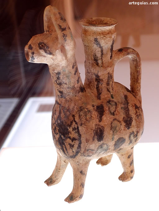 Pieza zoomorfa para verter líquidos, procedente posiblemente de una vajilla de gala, fabricada de cerámica vidriada con decoración verde y manganeso.
