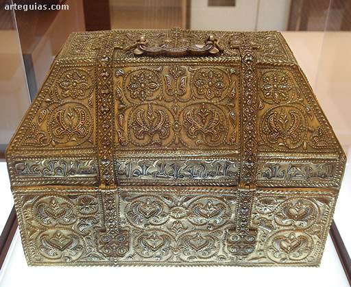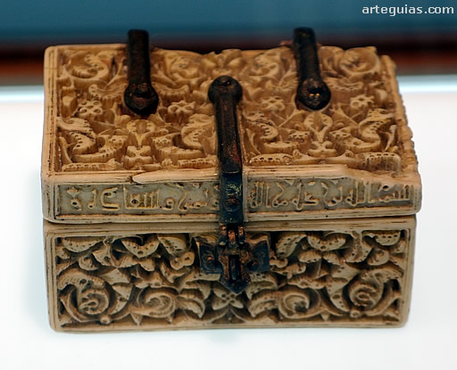 El original de este pequeño recipiente se encuentra en el Instituto Valencia de Don Juan. El material es marfil tallado con motivo de ataurique con bronce dorado. Data del año 966 d.C.