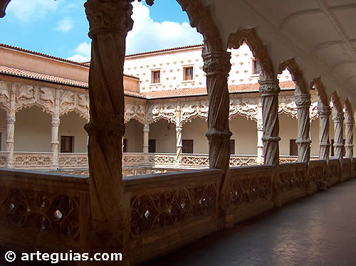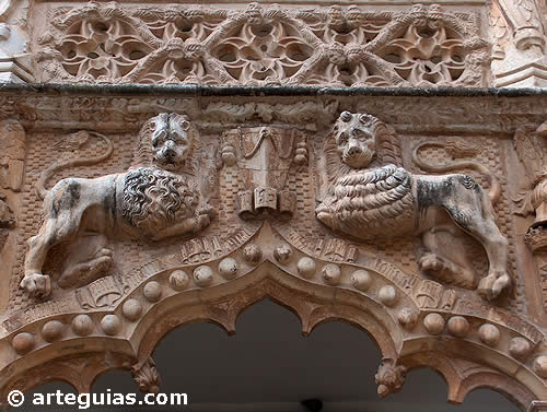 Impresionante aspecto del patio interior del Palacio del Infantado donde también se combinan elementos renacentistas (como por ejemplo las columnas toscanas) y decoración final goticista. Destacan las enormes estatuas de grifos y leones en las enjutas de los arcos mixtilíneos.