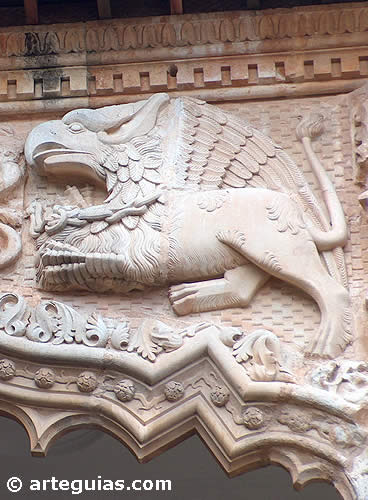 | Decoración escultórica en el patio del palacio | Vista del patio desde el piso superior | Grifo esculpido |