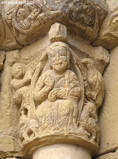 Sus capiteles muestran a Cristo en Majestad en la Parusía, rodeado del Tetramorfos, aves con frutos, animales devorando, un cantero, guerreros, etc. También son interesantes las mochetas con cabezas de león devorando humanos en lo que simbólicamente viene interpretándose como la muerte iniciática.