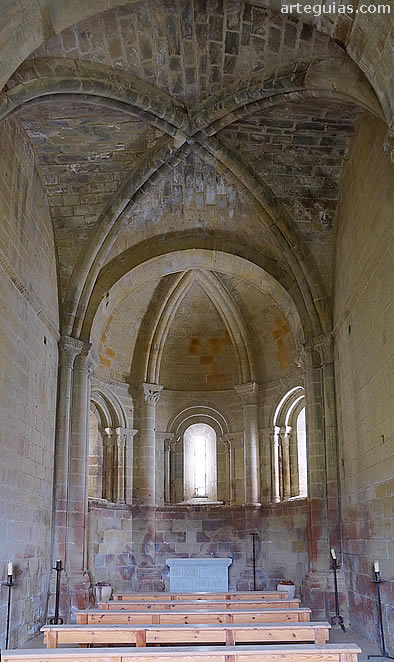 Su cabecera es la sencillez hecha arquitectura, puesto que su ábside de medio cilindro tan sólo ve interrumpida su lisura por una pequeña aspillera para permitir la iluminación del espacio interior.