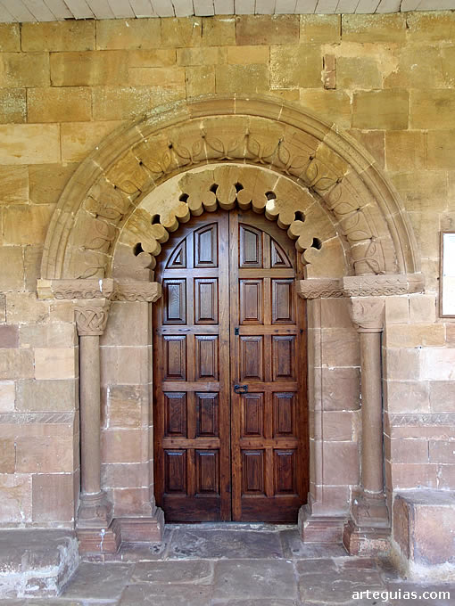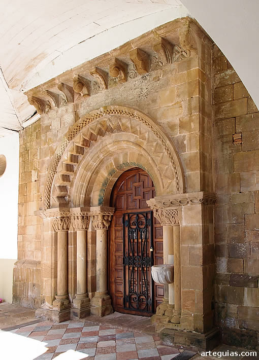 De las dos portadas, la principal se abre al costado occidental del templo, desplegando tres arquivoltas de medio punto abrazadas por una chambrana externa decorada a base de ajedrezado. De las tres roscas, la externa presenta molduración en zigzag, la intermedia medias cañas y la más interna flores inscritas en clípeos.