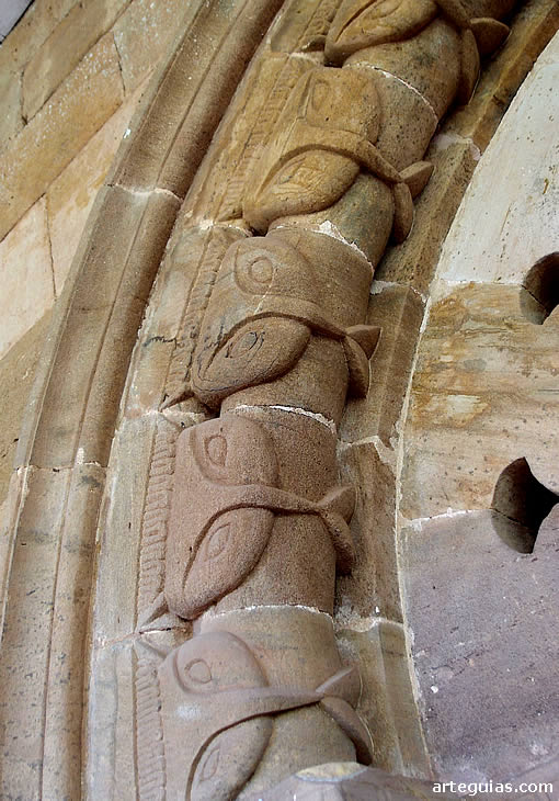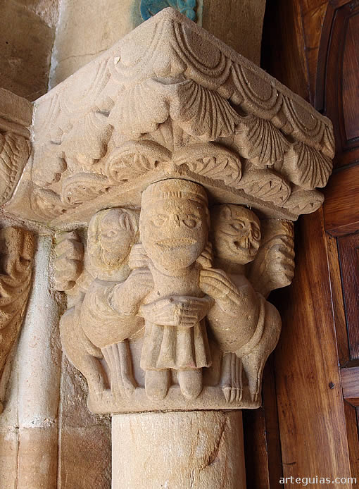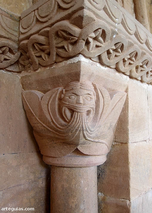 Los capiteles de esta puerta, de gran sencillez, presentan cintas perladas la cesta de la izquierda, y un mascarón antropomorfo regurgitando dos hojas la de la derecha (green man).