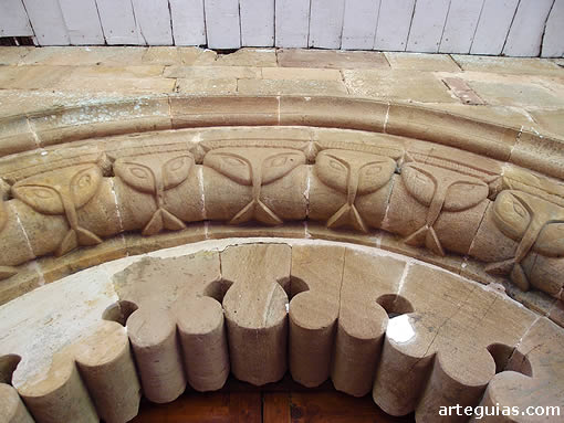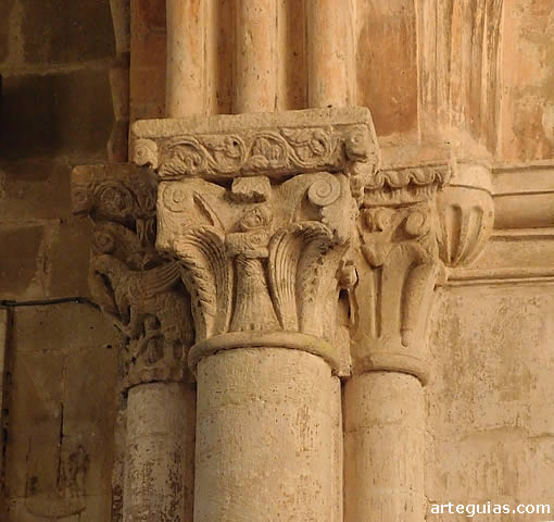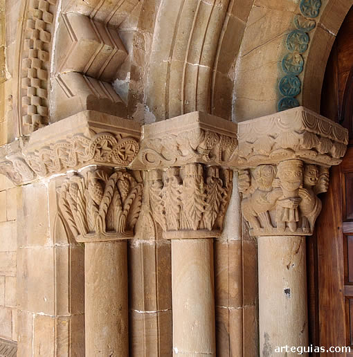 Descansan sobre tres columnas a cada lado rematadas todas ellas en capiteles vegetales de variadísima conformación; siendo la única excepción a este repertorio el capitel interior izquierda, donde fue plasmada una escena en la que dos fieras se abalanzan sobre un personaje central y que bien pudiera representar el episodio de Daniel en el foso de los leones.