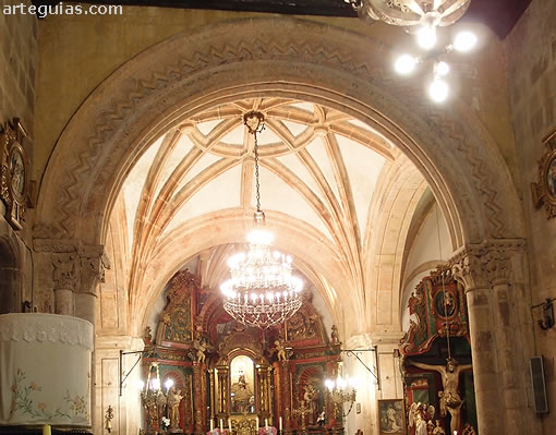 Comenzando por el interior, amen de los muros norte, sur y oeste de la nave, el único elemento reconociblemente medieval es su arco triunfal que daba paso a la cabecera, la cual fue sustituida durante la Edad Moderna por la estructura hoy visible de crucero y ábside poligonal.