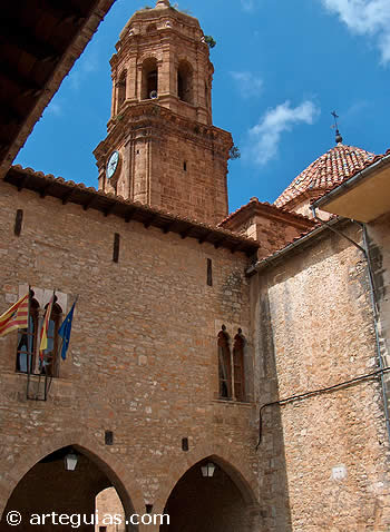 El rincón más exquisito de Iglesuela de Cid es la Plaza de la Iglesia, un recinto delimitado por el edificio de ayuntamiento, la iglesia y la Casa Blinque.