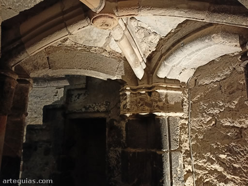 La cabecera es de lo más interesante. Su arco triunfal se apoya sobre dobles columnas geminadas constituidas con fustes romanos cortos y superpuestos, rematados en capiteles primitivos.