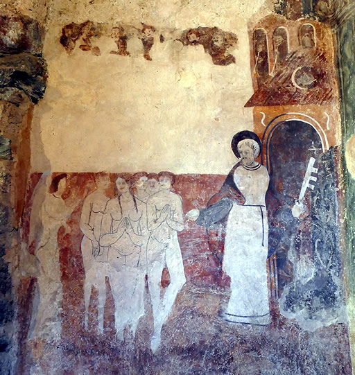 Sobre estas pinturas románicas, existe parte de una capa pictórica más moderna (siglo XVI) que incluye de nuevo a Cristo en Majestad y al Tetramorfos completo, todo ello ubicado en la bóveda del ábside. También este mural pictórico se extiende a los muros norte y sur de la cabecera. En el norte aparecen los bienaventurados entrando por la puerta del Paraíso donde son recibidos por San Pedro. En el muro meridional los condenados están rodeados de llamas.