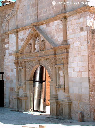 La puerta monumental del recinto monacal se encuentra alineada con la del templo, en el costado occidental y es un ejemplar renacentista del siglo XVI de estructura similar a un arco de triunfo romano, con arco de medio punto flanqueado por estructura de columnas toscanas y hornacinas. Por encima, hay un frontón triangular con la imagen de La Virgen y dos columnas jónicas en los extremos.