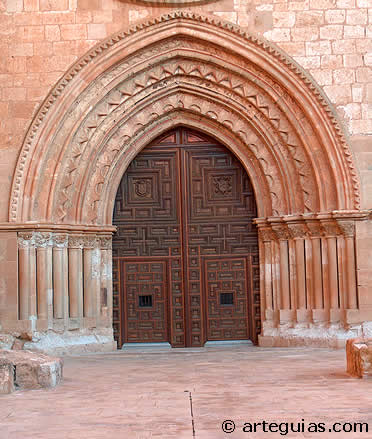 La puerta tiene seis amplias arquivoltas de perfil apuntado y de distinta decoración geométrica, la mayoría basada en finos boceles, aunque hay una con dientes de sierra y otra angrelada. El guardapolvos lleva puntas de diamante. El conjunto columnario tiene capiteles de hojarasca vegetal gótica.