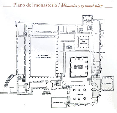 El profesor Manuel Castiñeiras afirma que seguramente en torno a este claustro se situarían, en la panda oriental, la Sala Capitular, y, justo enfrente, el refectorio, la cocina y las bodegas. En el ala norte se encontrarían los dormitorios y en un primer piso estaría ubicada la biblioteca. Sin embargo las posteriores reformas que se emprendieron en época moderna hicieron que todas estas dependencias desapareciesen, sobreviviendo de época medieval tan sólo el piso inferior del Claustro de los Obispos y una parte de la iglesia.