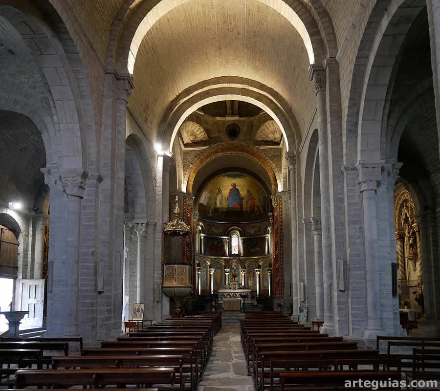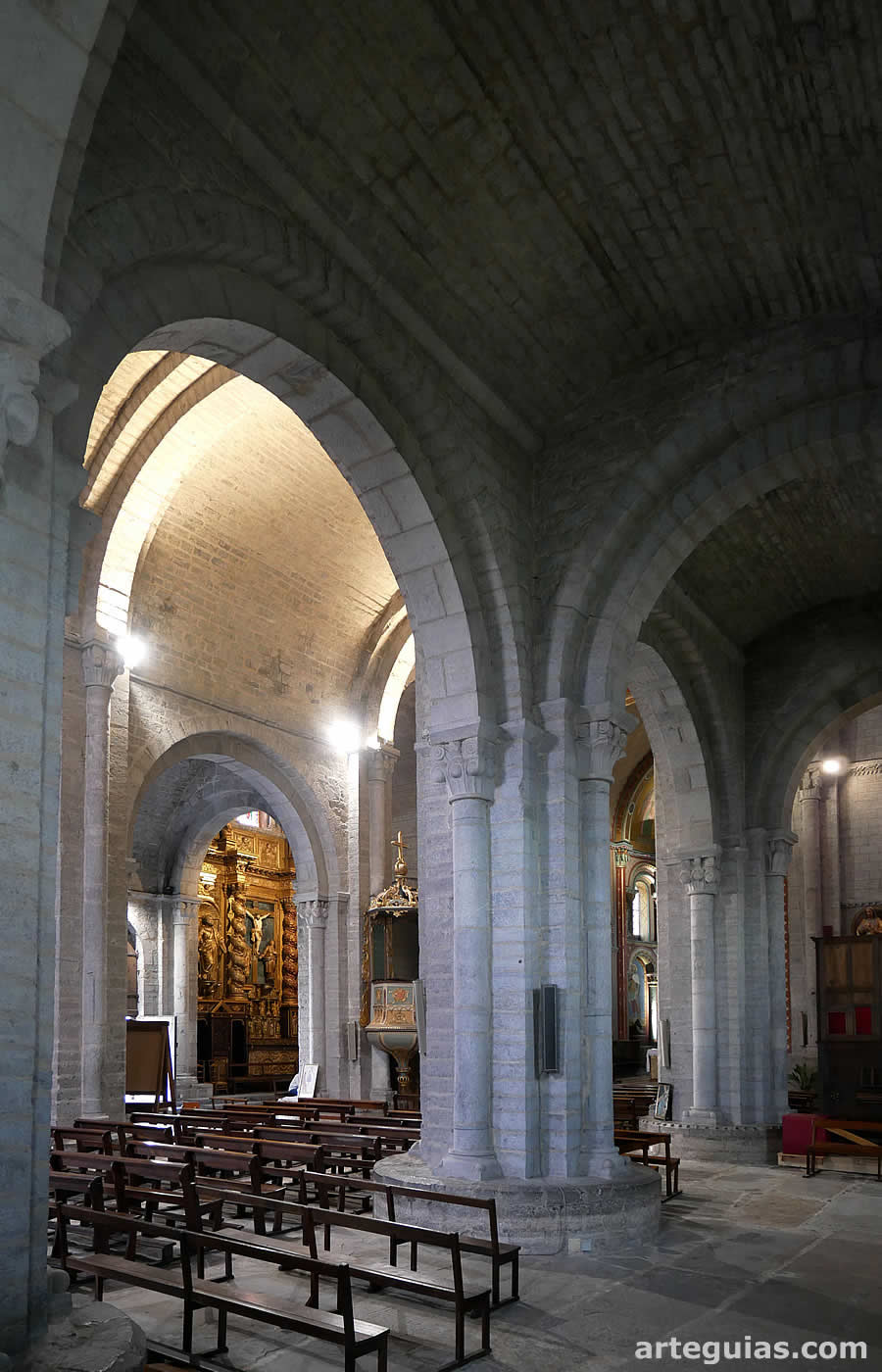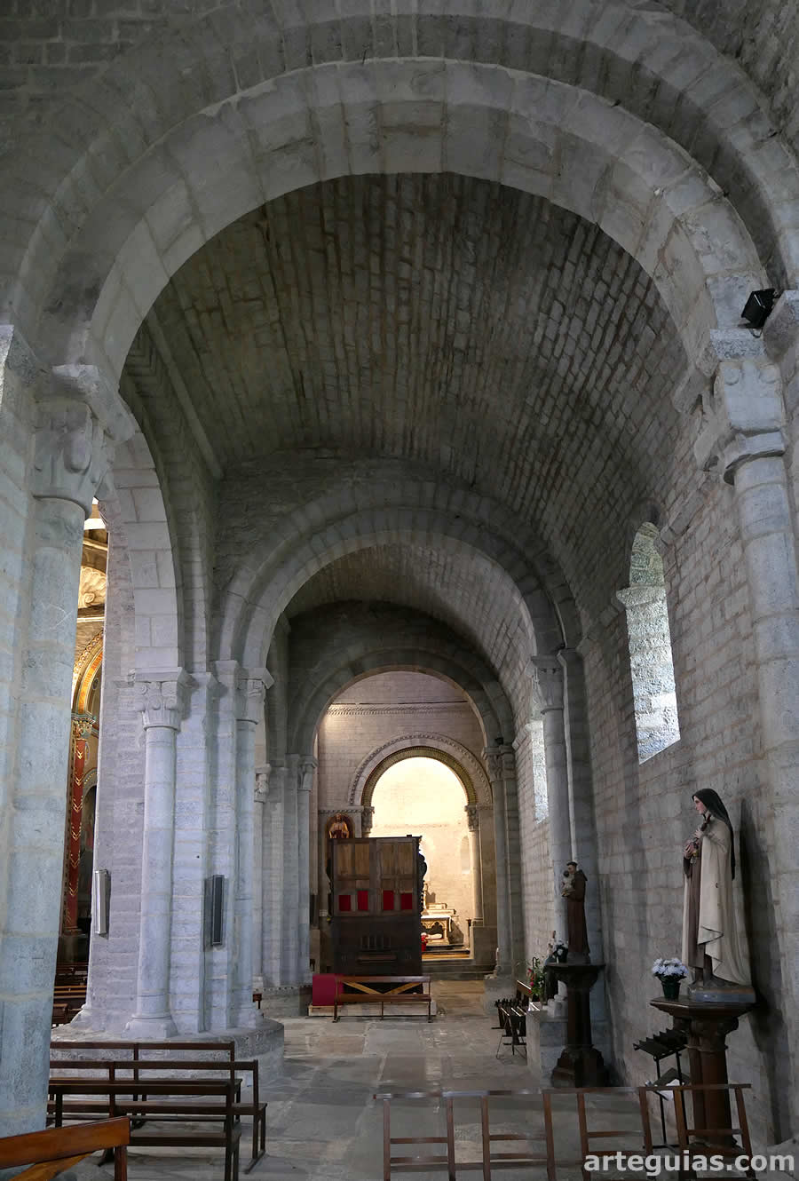 Las tres naves se separan entre sí mediante pilares de sección cruciforme con semicolumnas en cada cara que recogen los arcos formeros y los fajones de las tres bóvedas que son de medio cañón en la nave central y de cuarto de cañón en las nave laterales. El transepto se cubre igualmente con bóveda de medio cañón.