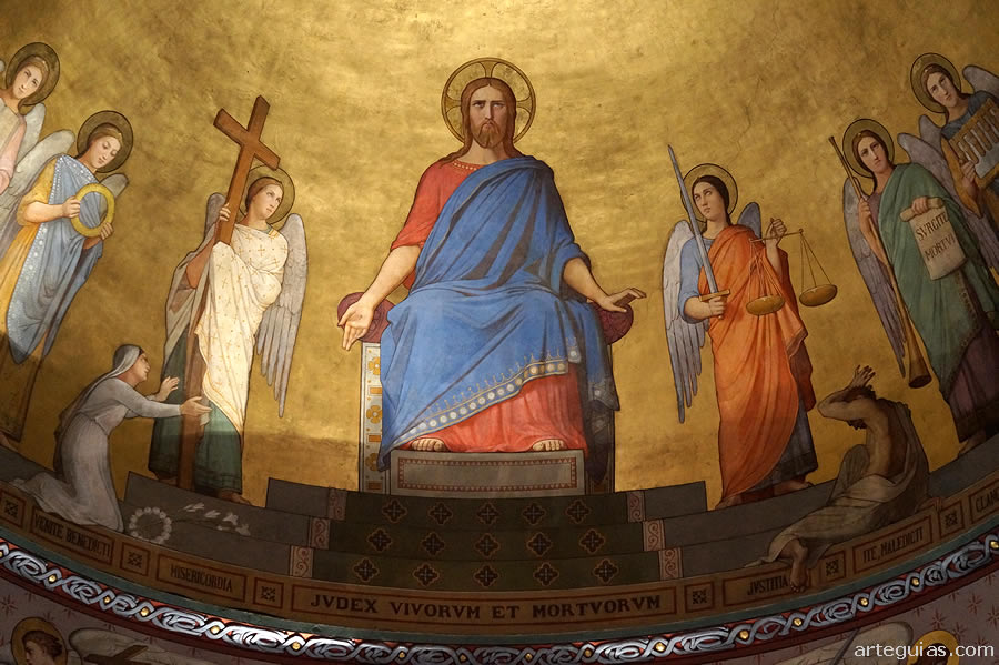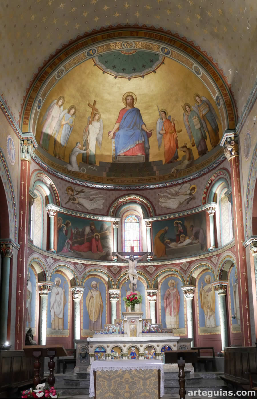 En el ábside central se pintaron en el siglo XIX -como es frecuente en la arquitectura medieval francesa- pasajes bíblicos con gran cromatismo. En este caso, los temas tratados son la Pasión de Cristo y la Parusía y son obra de Bertrand Bernard y Romain Cazes. Por debajo, corre una arquería mural románica sobre columnas. En las superficies bajo dichos arcos también se pintaron santos en la restauración decimonónica.