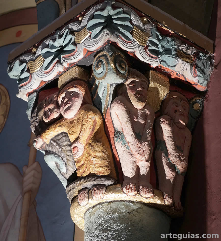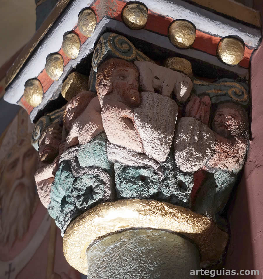 A nosotros nos importan mucho más los capiteles de la arquería románica que no se salvaron de un repinte en las fechas citadas del siglo XIX.
