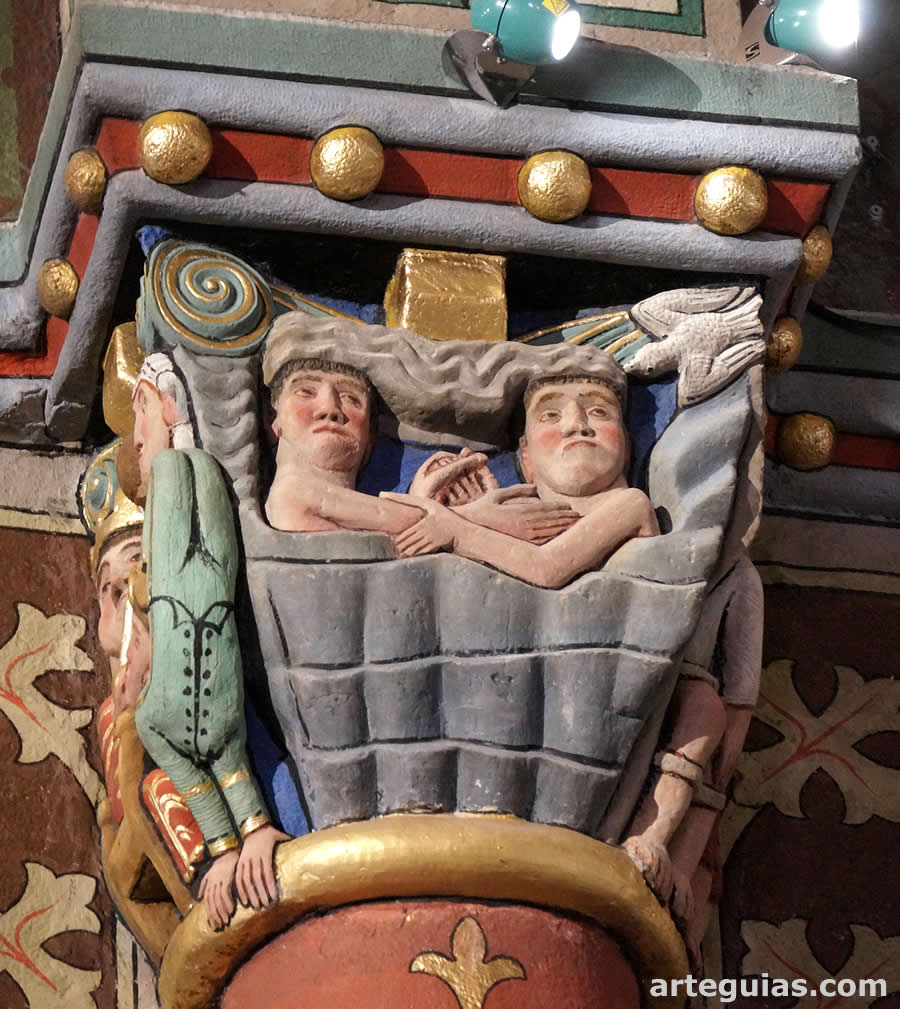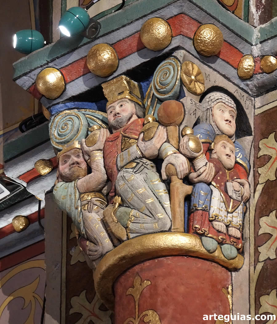 Se representaron -entre otras escenas- El Pecado Original con el asesinato de Abel a manos de Caín, El ciclo de San Juan Bautista, La Epifanía de los Reyes Magos, un oferente entregando la planta de la iglesia a Cristo, dos flautistas con un danzante, etc.