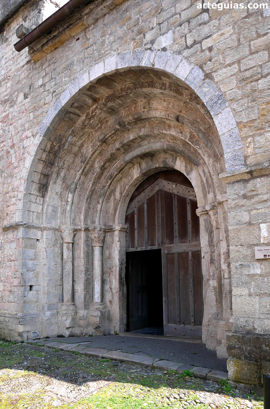 En el costado septentrional se abre una portada románica que consta de seis arquivoltas de medio punto de perfil plano algunas y otras de esquinas aboceladas. Los apoyos son las jambas y dos pares de columnas. Dos de ellas todavía conservan relieves donde se aprecian aves y un hombre atosigado por animales que probablemente son dragones.
