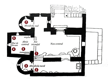 Los precedentes que llegaban del sur de Francia en cuanto a la arquitectura del siglo X sólo nos han dejado edificios menores que presentan, por lo general, planta rectangular con nave única o en ocasiones con naves laterales como Arles-sur-Tech y una cubierta de armazón de madera. Los ábsides suelen ser pequeños y estar cubiertos con bóveda de cascarón o de cañón. En un primer momento, su planta estaba realzada en el interior siendo cuadrada o poligonal al exterior. Más adelante se verá realzada por completo, evolucionando hacia la planta semicircular característica del ábside románico.